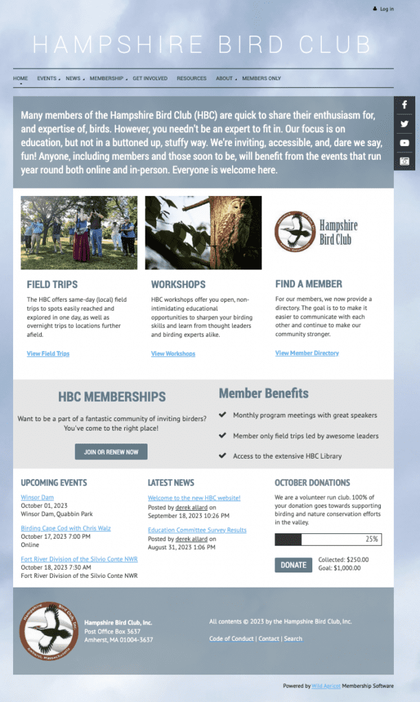 Why we love it: The Hampshire Bird Club’s website focuses on creating a great experience for the club’s members, including easy navigation to their events, directory and benefits. Plus their call for donations and visual bar graph showing their percent to goal makes fundraising easier.