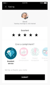 Uber prioritizes customer satisfaction by asking users to rate their service after every ride. Using a simple star system, customers can quickly describe their satisfaction with a couple clicks, with the option to add more detail.