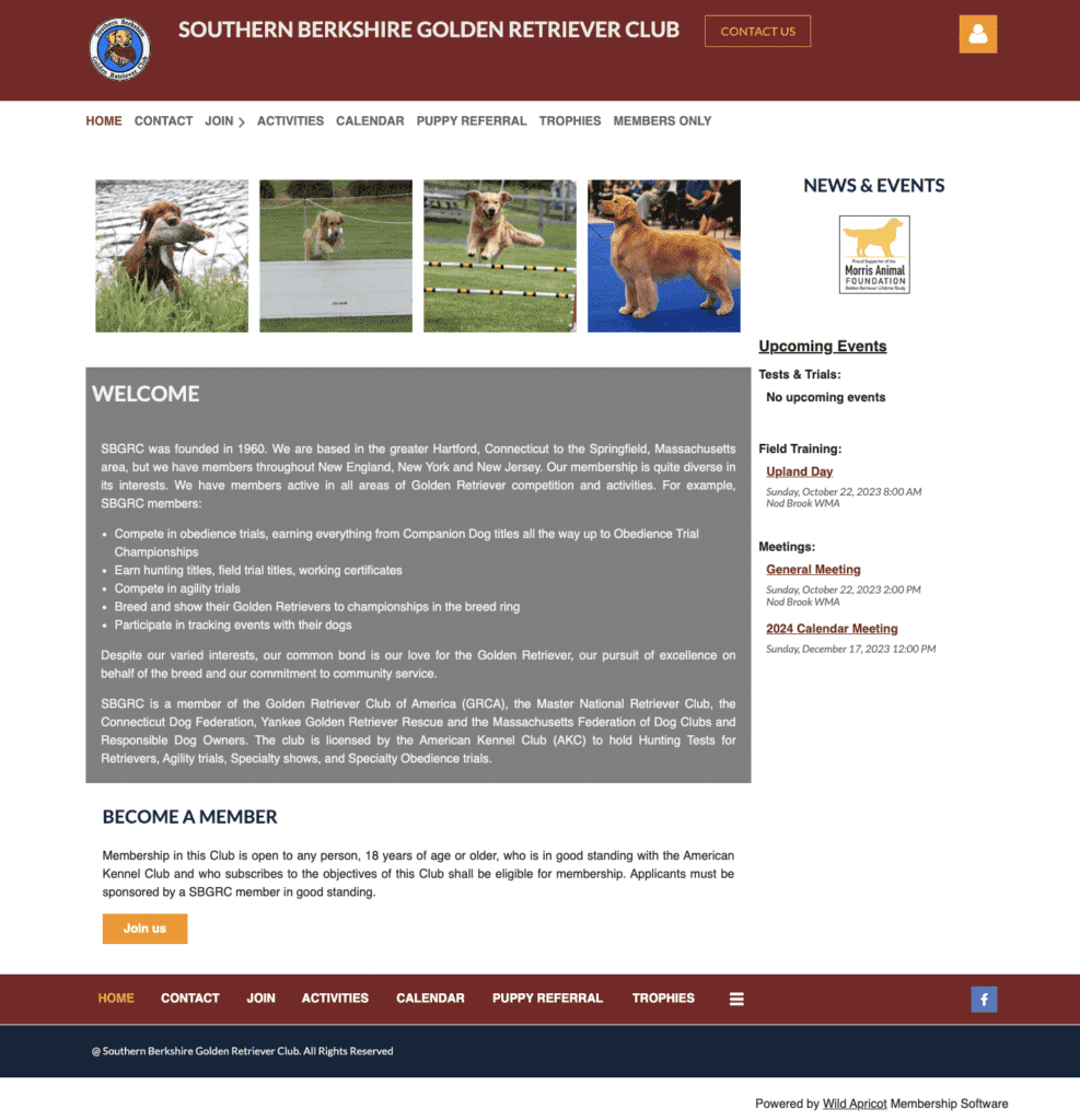 Why we love it: The SBGRC’s website includes all the must-have information right on their home page. They make great use of imagery, highlighting some beautiful golden retrievers doing activities club members can participate in. Plus, their navigation bar includes great resources specific to SBGRC members, like puppy referral.